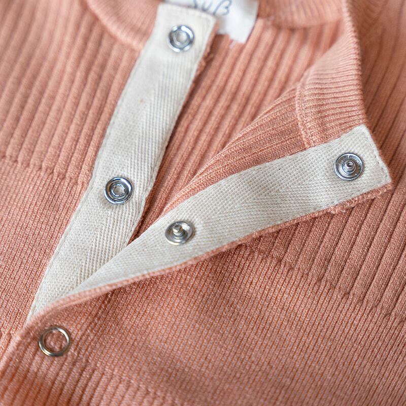 リングボタンの留め合わせ部分の内側にはオフホワイトのテープをあしらい、さりげない差し色としてデザインにアクセントを添えています。男の子にも女の子にも似合う、誰が着ても可愛らしいカーディガンです。