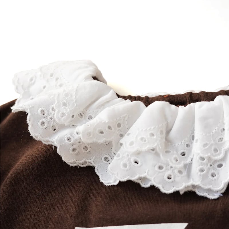 襟元と袖口に咲くようなレースがアクセント。カジュアルなTシャツデザインに華やかさとおしゃれ感が添えられています。