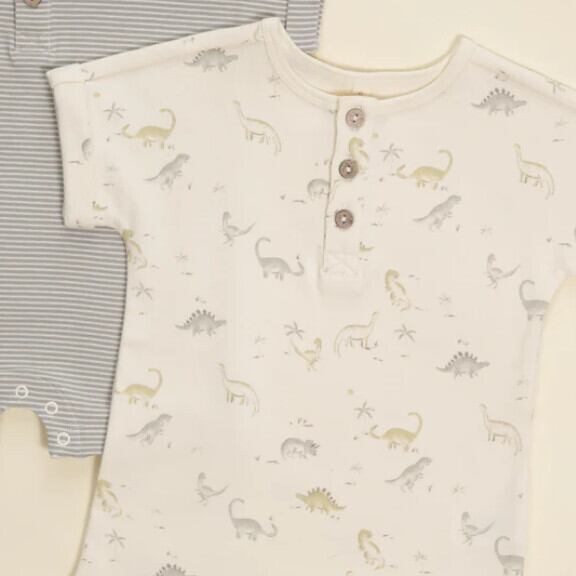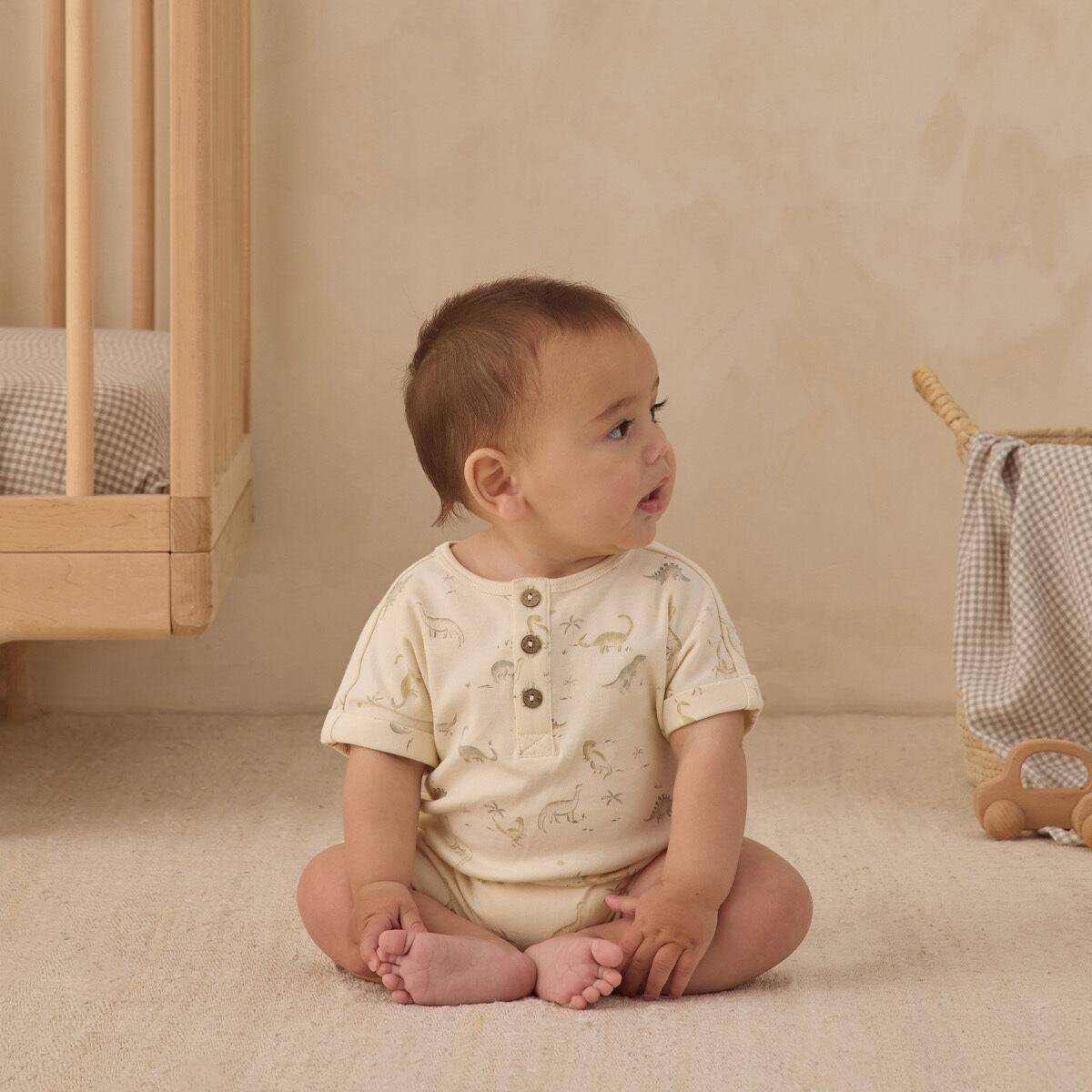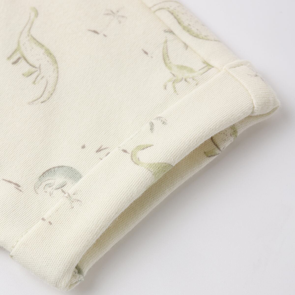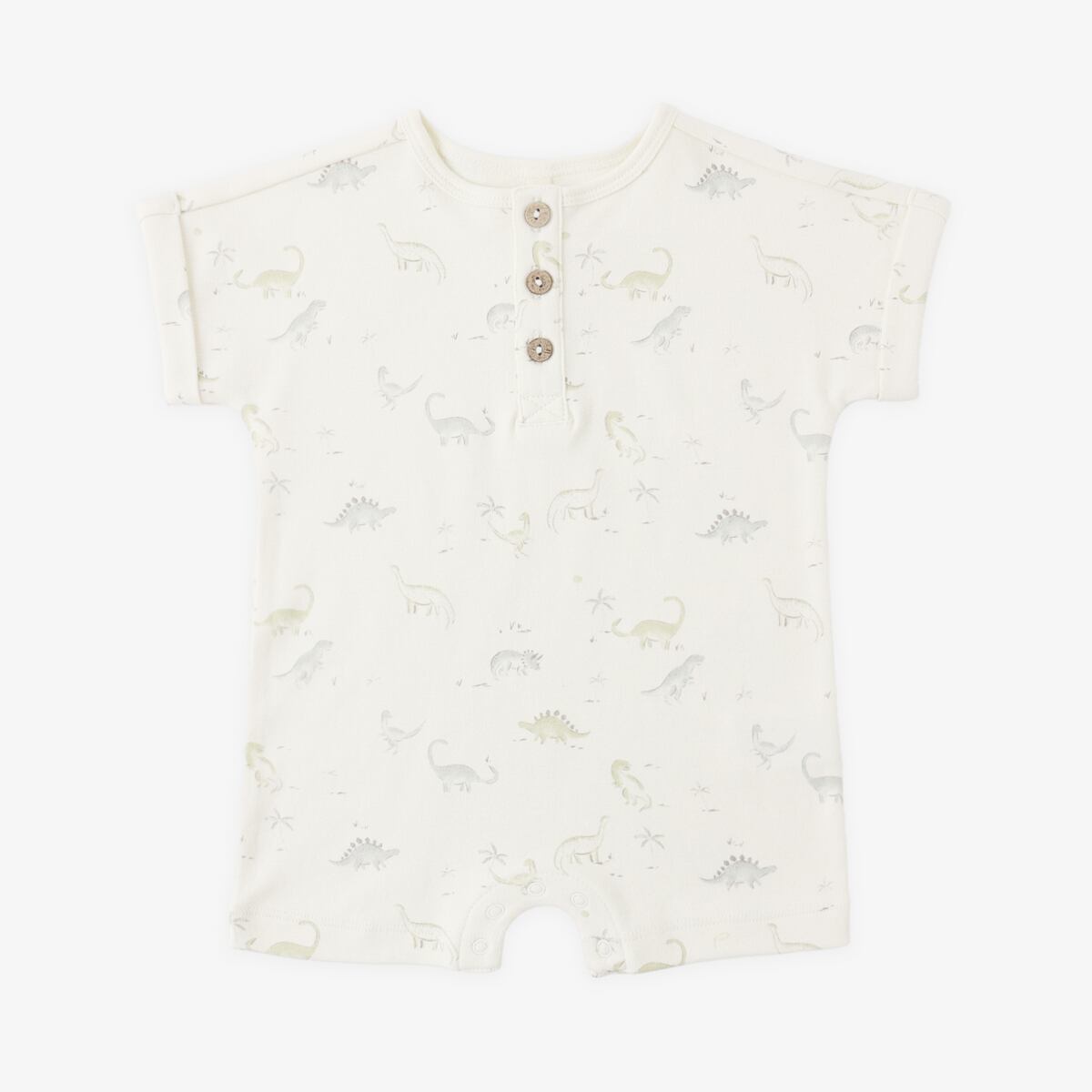 軽やかな着心地で、暑い季節に活躍する定番ロンパースです。やさしいアイボリーカラーに、愛らしいダイナソープリントがあしらわれています。