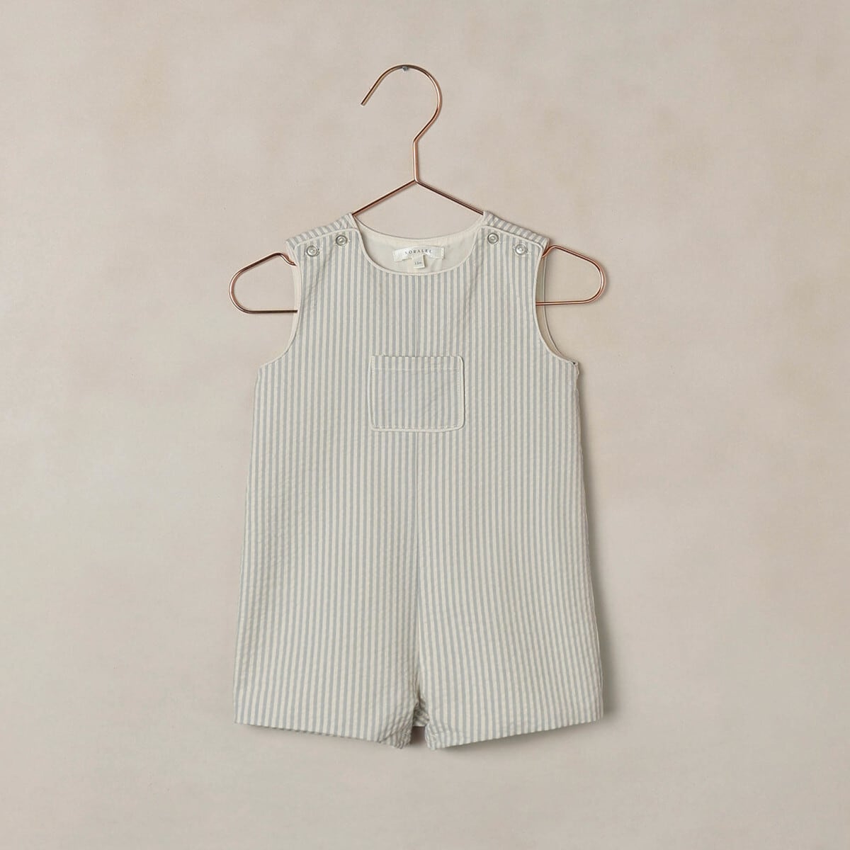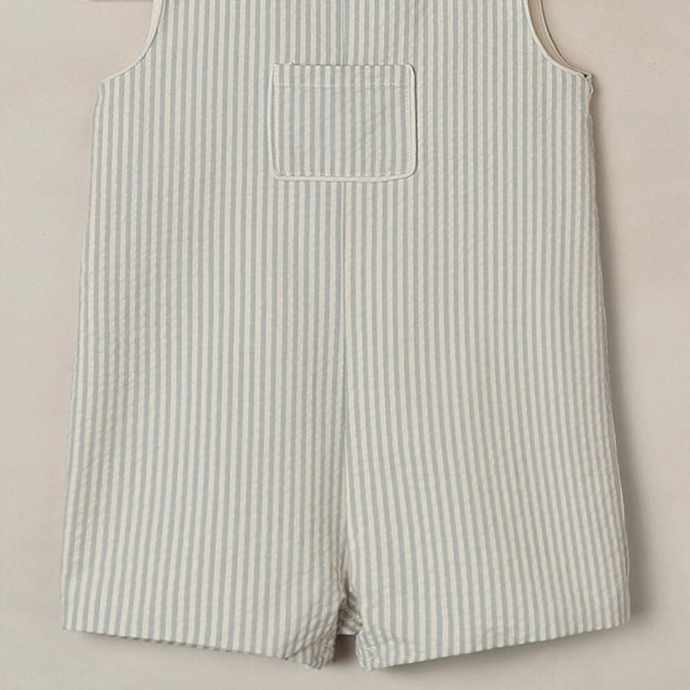 フロントのポケットがデザインのアクセント。ショルダー部分にはボタンが付いており、お着替えもスムーズに行えます。股下はスナップボタン仕様で、おむつ替えやお着替えも簡単です。