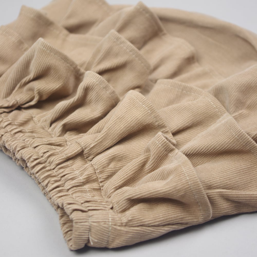 コーデュロイ素材でくすみカラーのフリルパンツは、