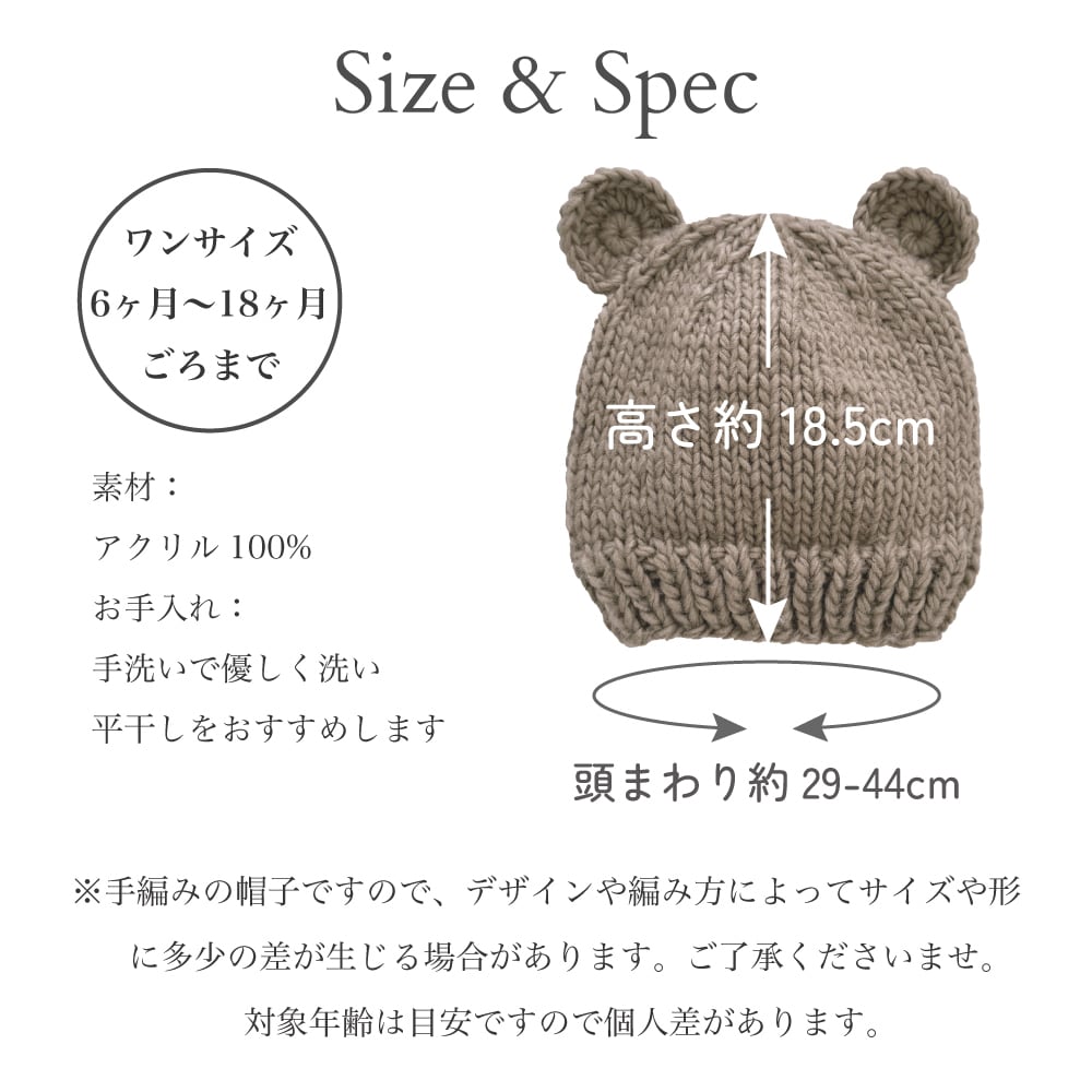 ワンサイズ展開ですが、柔らかく伸縮性に優れているニット素材なので、およそ対6ヵ月~18ヵ月ごろまでと幅広いお子さまにかぶっていただけます。