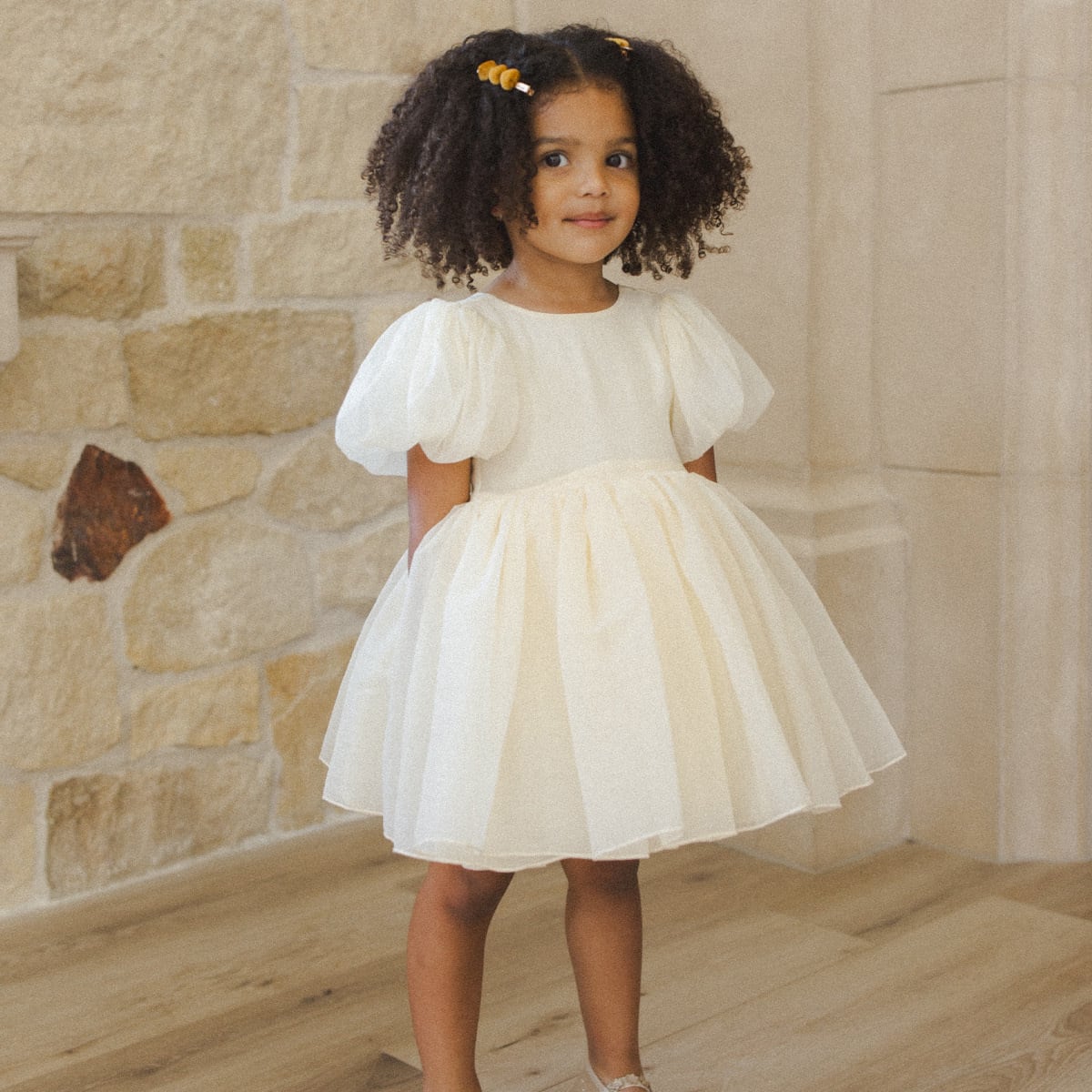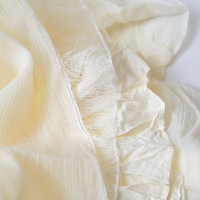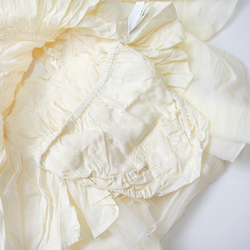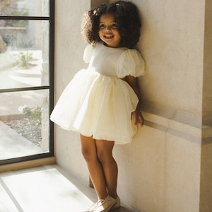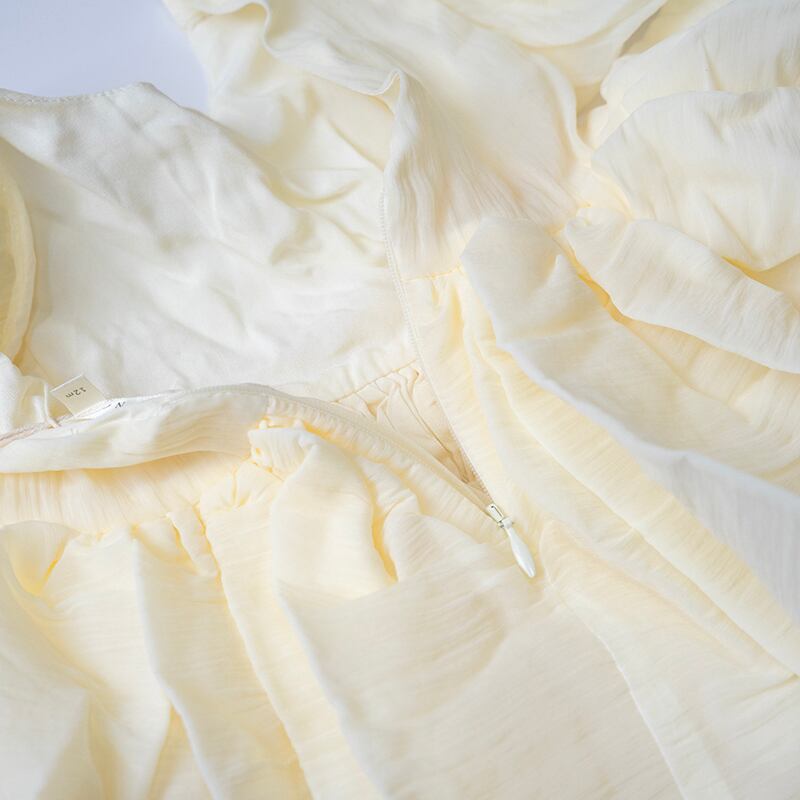 アイボリーのオーガンザを使用したソフィアドレスは、V字のバックディテールとファスナー、オーバーサイズのバルーン・パフスリーブ、オーガンザ・チュールを重ねたスカートが特徴です。