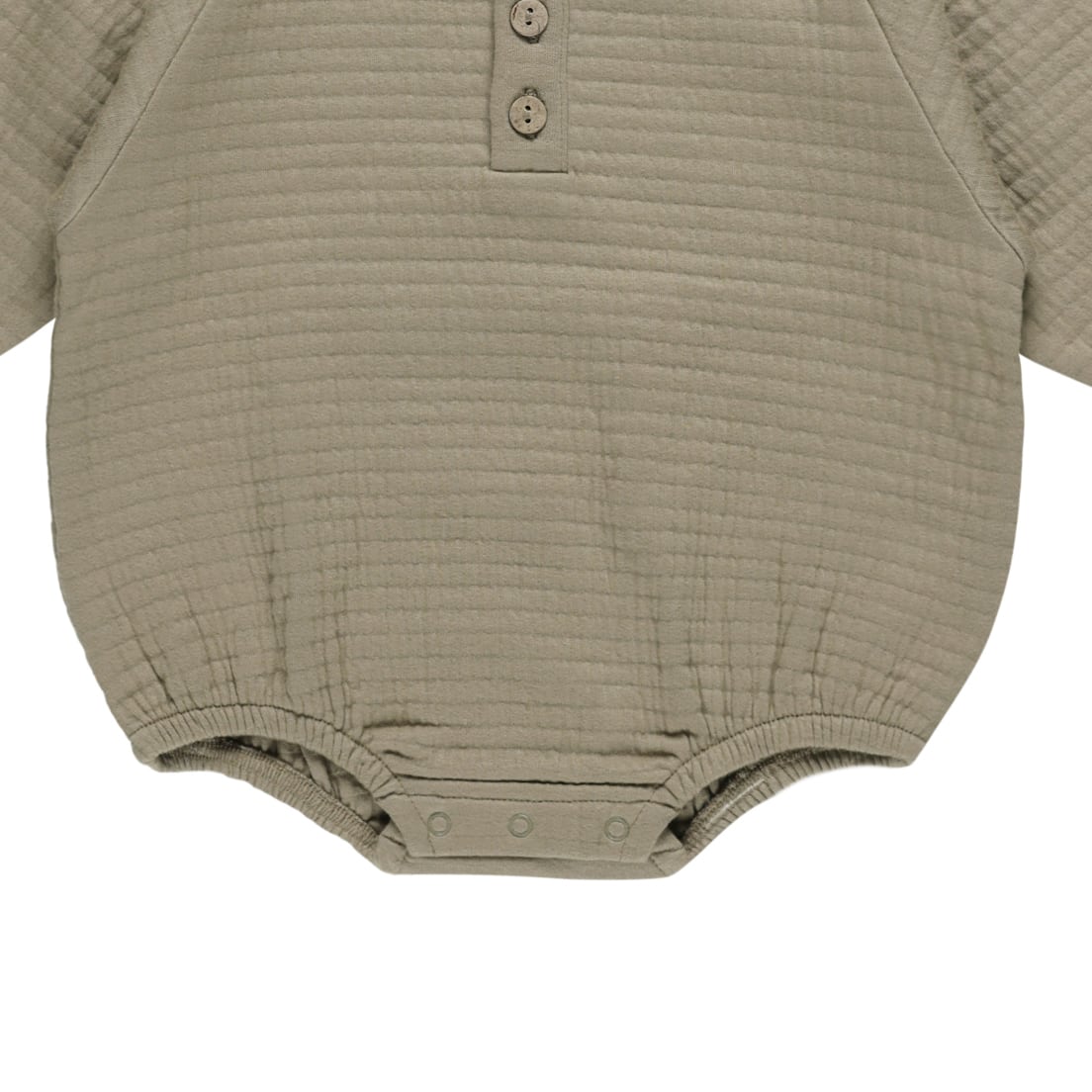 ソフトで肌触りのよいキルティング素材の長袖ヘンリーバブルロンパースです。